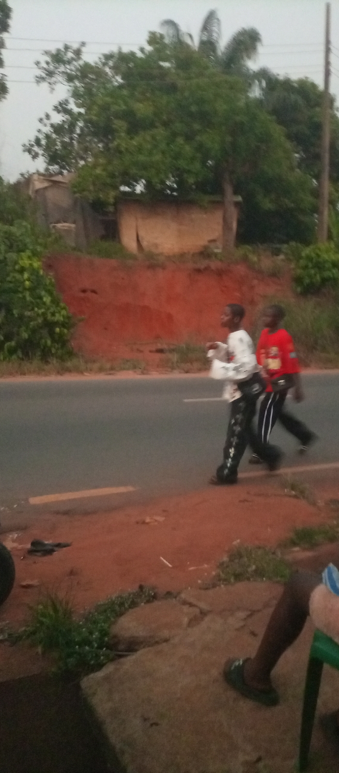 Two young people walk alongside a road. One is wearing a red shirt, the other a white shirt with decorative pants. A red dirt hill is adjacent to the road. A simple building is positioned on top of the hill. Trees are scattered around. A person sits on a chair in the foreground. A portion of a tire is also in the foreground.
