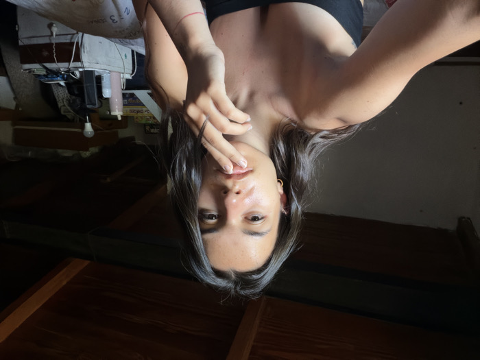 A young adult female is depicted in an indoor portrait, located in Reta, Argentina. She has dark, long hair, dark eyes, and fair skin. She is wearing a black strapless garment and a single gold-colored hoop earring in her left ear. A red string bracelet is visible on her left wrist. Her right hand is positioned with fingers (thumb and index) touching her lower lip. Her expression is neutral, and her gaze is directed at the camera. The setting is an interior space with an exposed dark wooden beam and plank ceiling. Natural light illuminates the subject from the front-right. To the right of the subject, a white, multi-drawer dresser is visible. On its surface, objects include a white LED bulb, a pink cylindrical bottle, a white cylindrical bottle, a black rectangular electronic device, and multiple cables. Further into the background, indistinct items are stacked. A white pillow with handwritten text including "2 = 3" is visible in the lower right foreground.