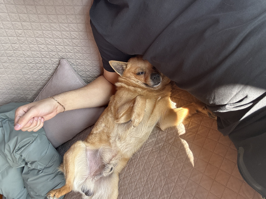 The scene is an indoor setting in Chorul, Bulgaria, illuminated by natural sunlight. A light-brown, short-haired dog, appearing male, lies supine on a quilted light-brown comforter. Its front paws are drawn towards its chest, and its eyes are narrowed, suggesting a state of rest. Adjacent to the dog, the left arm and upper torso of an individual are visible, clad in a dark, possibly black, long-sleeved garment. A thin, gold-colored chain bracelet is present on the individual's left wrist. A grey pillow and a crumpled light-green blanket are partially visible in the background, to the upper left of the dog. No active interaction is depicted; both subjects appear to be resting.