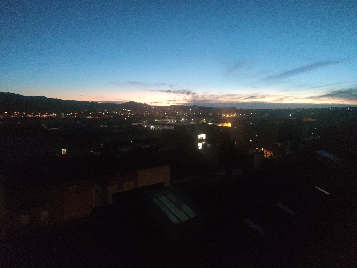A cityscape unfolds at dusk, where buildings cast deep shadows in the foreground. Streetlights illuminate a distant hillside, creating a visual horizon. The sky transitions from a deep blue to a soft orange and pink hue near the horizon line, with wisps of clouds adding texture to the evening sky.