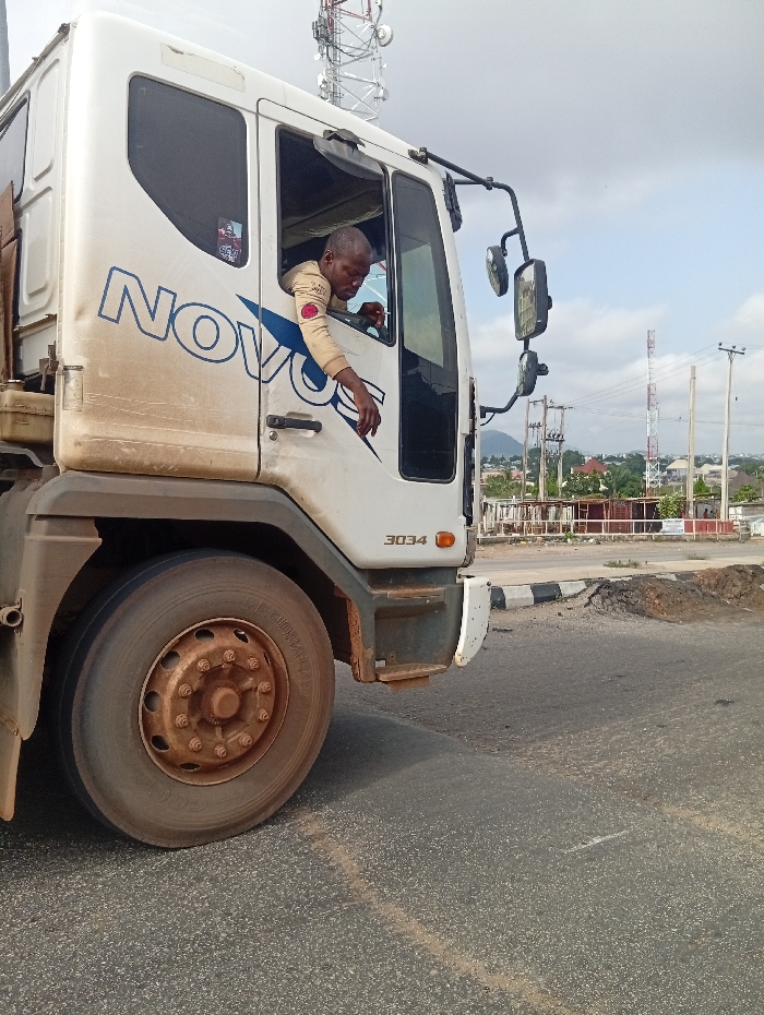 A white cab-over-engine truck, displaying "NOVO" in blue lettering and the number "3034," is depicted stationary or moving slowly on an asphalt road in Adankolo, Nigeria