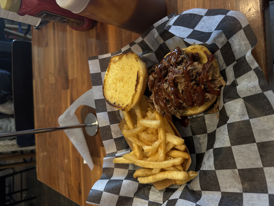 - "A close-up, high-angle image depicts a meal served on a black and white checkered wax paper liner within a basket, positioned on a light brown wooden table" by FM-RVmgE3, licensed under CC BY 4.0