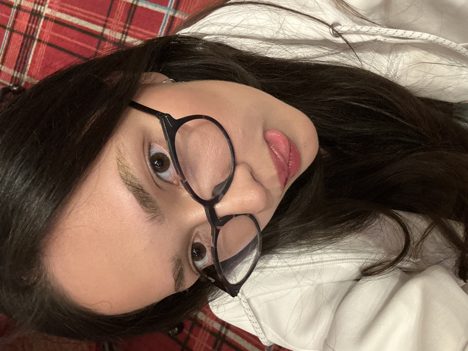 A young adult female is depicted in a close-up, high-angle shot, looking directly at the camera with a playful expression. She has dark brown eyes, light skin, and long, dark brown hair. She wears dark-rimmed glasses, with "Bass" visible in small print on the upper left portion of the left lens (viewer's left). Her lips are coated with a pink gloss, and her tongue is slightly extended from her mouth. She is wearing a white hooded sweatshirt with a visible zipper track and white drawstrings. The background consists of an out-of-focus red and white plaid pattern. There are no identifiable features or objects within the image to determine its specific location within the city of Las Vegas, United States.