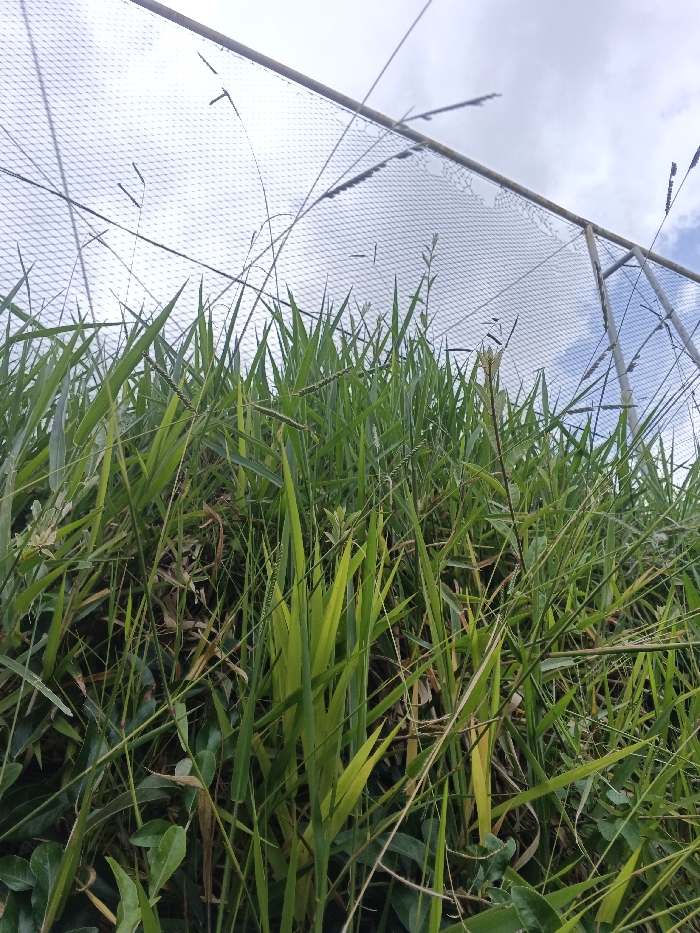 The image displays an upward-angled view of dense green grass and other vegetation in Pinnwe, Myanmar. The foreground is filled with various types of grass, some featuring prominent seed heads. Behind the tall vegetation, a light-colored, fine mesh or chain-link fence extends horizontally across the frame, partially obscured by the plants. The fence appears to be supported by a metal frame, visible on the right side, suggesting an enclosed area. Above the fence, a cloudy sky is visible. No individuals, specific actions, or interactions are discernible.