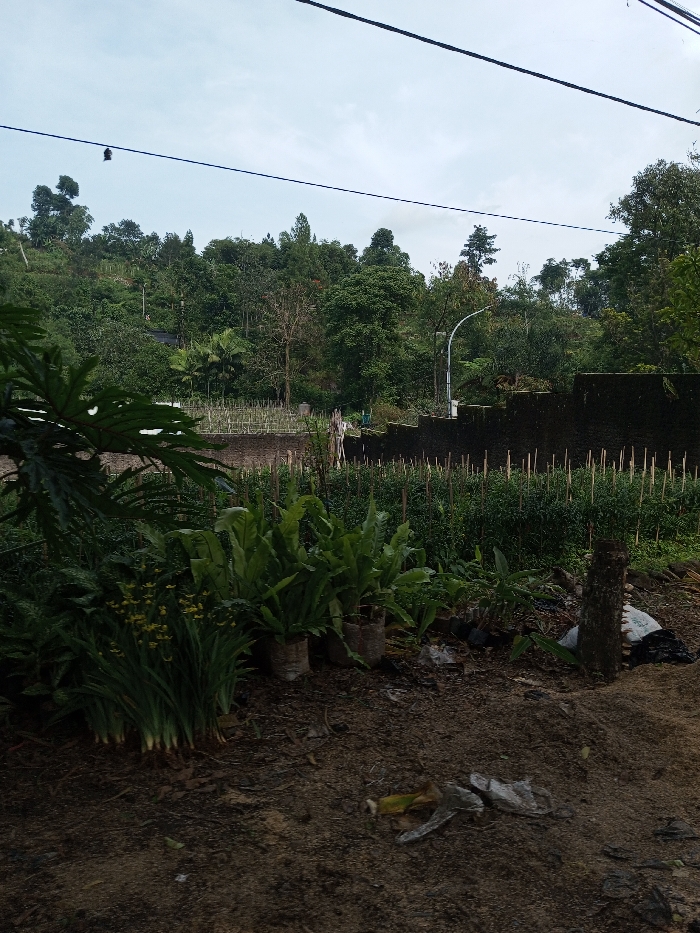 This image depicts a rural scene in Kandenuwara, Sri Lanka, characterized by agricultural activity and natural vegetation under an overcast sky. The foreground comprises dark brown soil littered with natural debris and scattered refuse including plastic and dried plant matter. On the left, a cluster of green plants with long, strap-like leaves and yellow flower stalks are grouped together, alongside several larger, dark green fern plants in individual woven containers. A large, dark leaf partially obstructs the far-left foreground. A rough-hewn wooden post stands upright on the mid-right, with a white bag visible behind it. In the midground, a cultivated field extends horizontally, featuring rows of numerous small, green plants supported by vertical wooden stakes. Behind this, a dark, textured wall, possibly concrete, runs across the scene. A white street lamp on a pole is positioned behind and to the left of this wall. A figure, likely a person, is partially visible in light clothing standing in a further cultivated area to the left, near some vertical supports. The background is dominated by a densely forested hill, featuring various shades of green foliage and numerous trees, including a prominent slender tree rising above the general canopy near the center-right. Two dark, horizontal lines, consistent with power or utility lines, stretch across the upper portion of the frame, with a small, dark object suspended from the top line on the left. The sky is uniformly light grey, indicating an overcast condition.