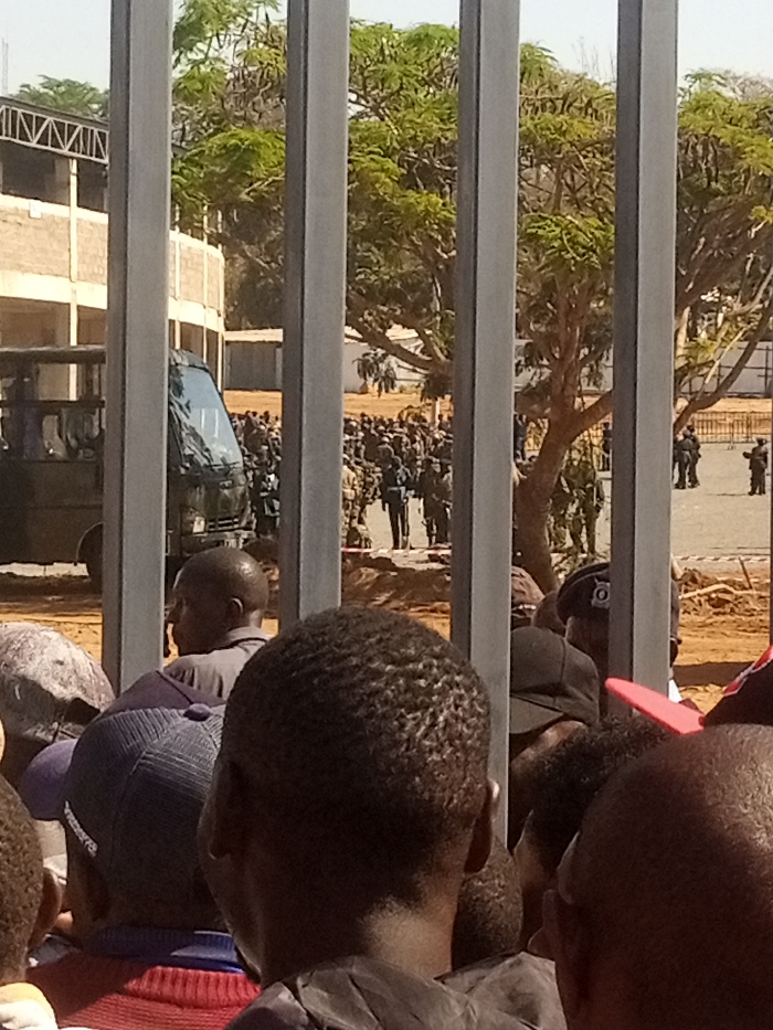 The image captures an outdoor scene in the city of Kitui, Kenya, viewed through a series of vertical, grey metal bars. In the immediate foreground, the backs of several individuals' heads are visible, observing the scene. One individual to the right foreground has tightly curled dark hair; another in the mid-foreground wears a dark blue baseball cap; and another, further back on the left, has very short, shiny dark hair and is facing left. Beyond the bars, a large gathering of individuals is present on a predominantly light brown, dirt-covered ground. Many individuals in the mid-ground and background are uniformed, appearing to be military or law enforcement personnel, standing in formations or groups. On the far left, a multi-story building under construction or renovation is visible, featuring concrete block walls and an exposed framework. Adjacent to this building, a dark-colored vehicle, possibly a utility truck or armored personnel carrier, is partially visible, facing right. Several large trees with green foliage are scattered across the scene, with the sky appearing bright and clear above. Orange barriers are faintly discernible in the far right background, near additional uniformed figures.