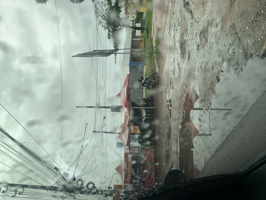 A street scene in Camaragibe, Brazil, is depicted from inside a vehicle, viewed through a rain-streaked windshield