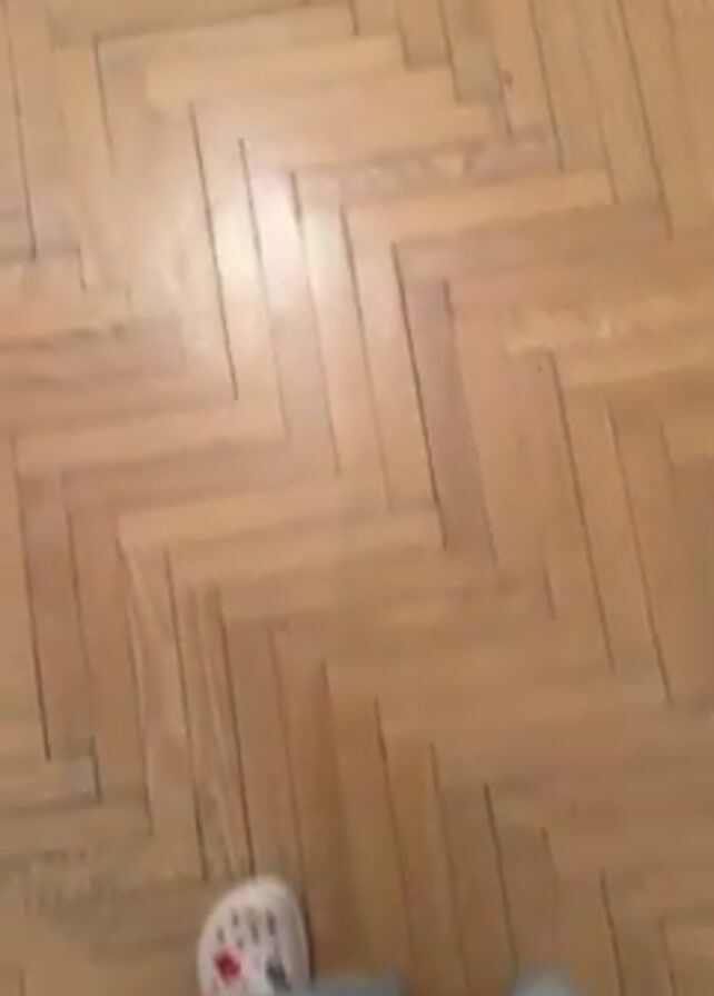 A person with light skin, wearing jeans and pink Crocs, walks on a wooden parquet floor towards a white rug. The person then approaches a desk or table, and turns the camera to face themself. The person is a woman with dark hair pulled back in a ponytail, wearing a printed animal print top. She puts her hands up to her face, exclaims, and cries.