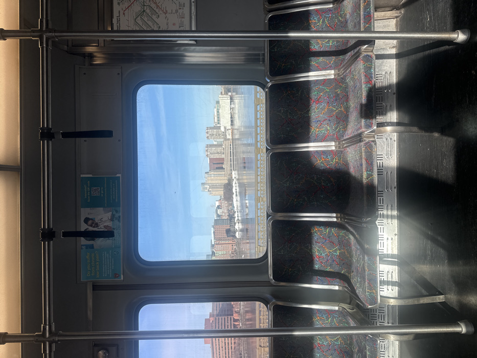 Inside a train car, rows of empty seats line up next to a window. The seats have a dark, patterned upholstery. Light streams in through the window, illuminating the seats with bright patches. Outside the window, a cityscape is visible, with buildings reflected in the water. A handrail runs along the length of the seats. Advertisements are placed on the wall between the windows.