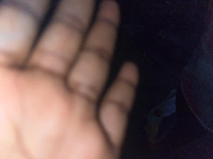 The image captures a severely out-of-focus and dimly lit scene in Sardauna, Nigeria. A human hand, palm facing the viewer, occupies the left and central portions of the frame. The fingers are extended upwards and rightward. The skin tone is medium. All anatomical details of the hand are indistinct due to extreme blur. The background is predominantly dark and undifferentiated. A light blue-grey object, possibly fabric, exhibiting an irregular shape and a small, darker, amorphous mark, is dimly visible in the lower right quadrant. No specific actions, interactions, or additional environmental features are discernible within the frame.