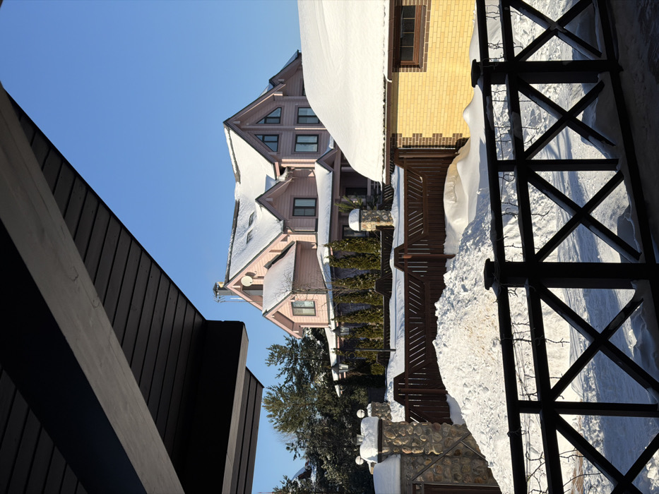 The image displays a snow-covered residential landscape in Mishutkino, Russia, under a clear blue sky. The foreground features a dark brown wooden railing with an X-pattern and icicle-style string lights, positioned beneath a dark overhead structural beam. Immediately beyond the railing, a large, irregularly shaped mound of snow, exhibiting yellowish-brown discoloration, is prominent. This snow pile is situated in front of a dark brown wooden fence constructed with angled slats. The fence is flanked by stone pillars topped with spherical light fixtures. Behind the fence, a row of conical evergreen trees stands. To the right, a single-story auxiliary building with yellow brick walls, a brown-framed window, and a snow-covered roof is partially visible. The background is dominated by a large, light pink multi-story private residence featuring a complex gabled roof system heavily covered in deep snow. The house has numerous dark-framed windows, a chimney with a visible icicle, and a satellite dish mounted on its side. Dense evergreen trees are discernible behind and to the left of the main residence. No individuals are present in the scene.