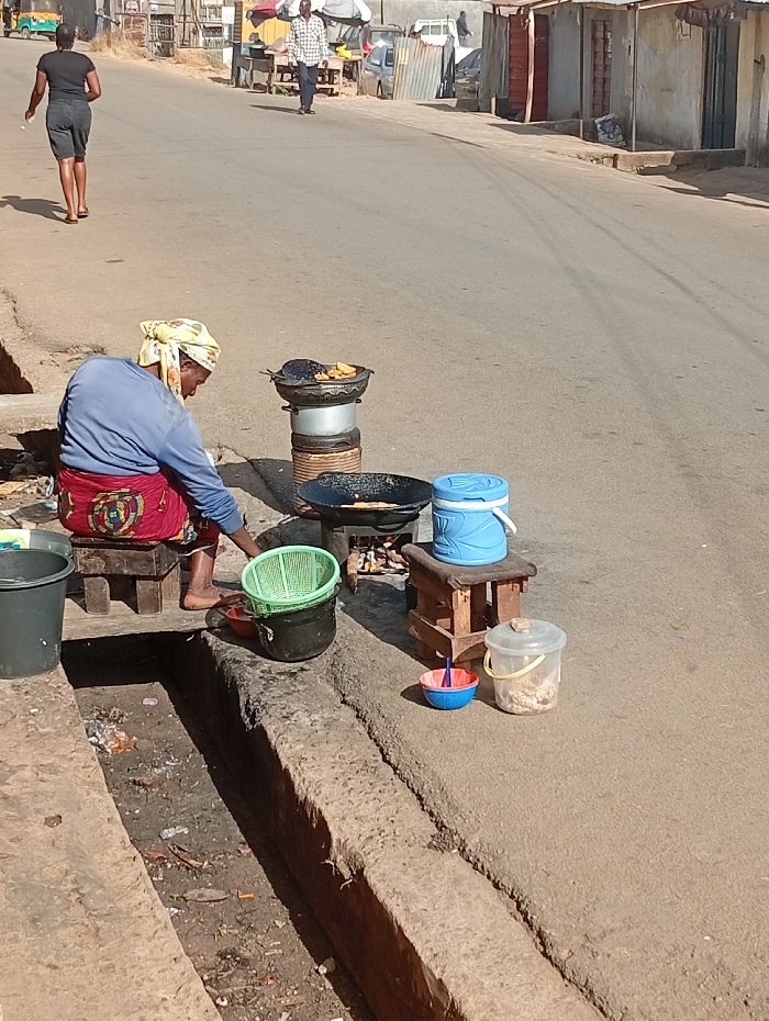 This image depicts a roadside scene in Jos, Nigeria, characterized by street vending and pedestrian activity under clear daylight