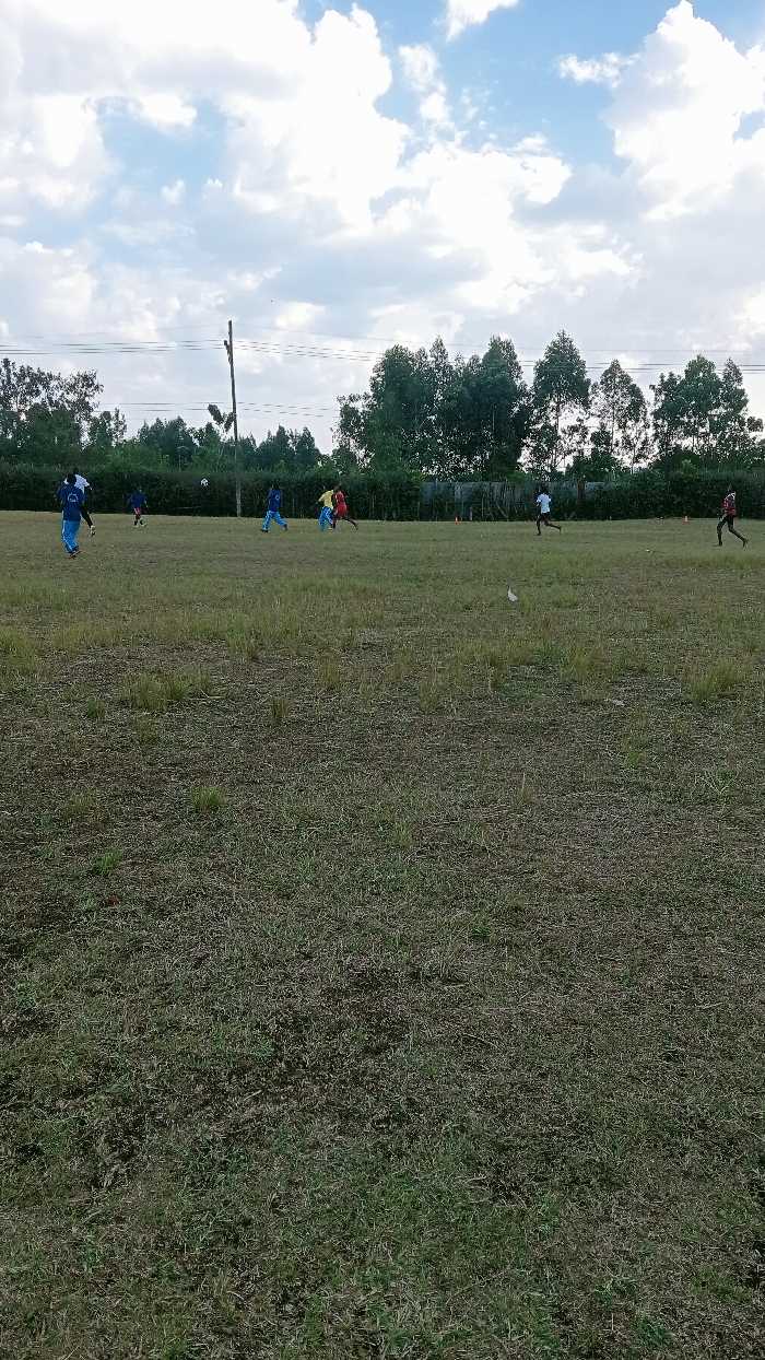 A grassy field stretches to a line of trees under a cloudy sky. Several people are scattered across the field, seemingly playing a sport, possibly soccer, with a ball visible in the air. Cones are set up as markers. The field's grass is a mix of green and brown, suggesting a somewhat dry or unkempt condition. Overhead power lines are also visible in the background.