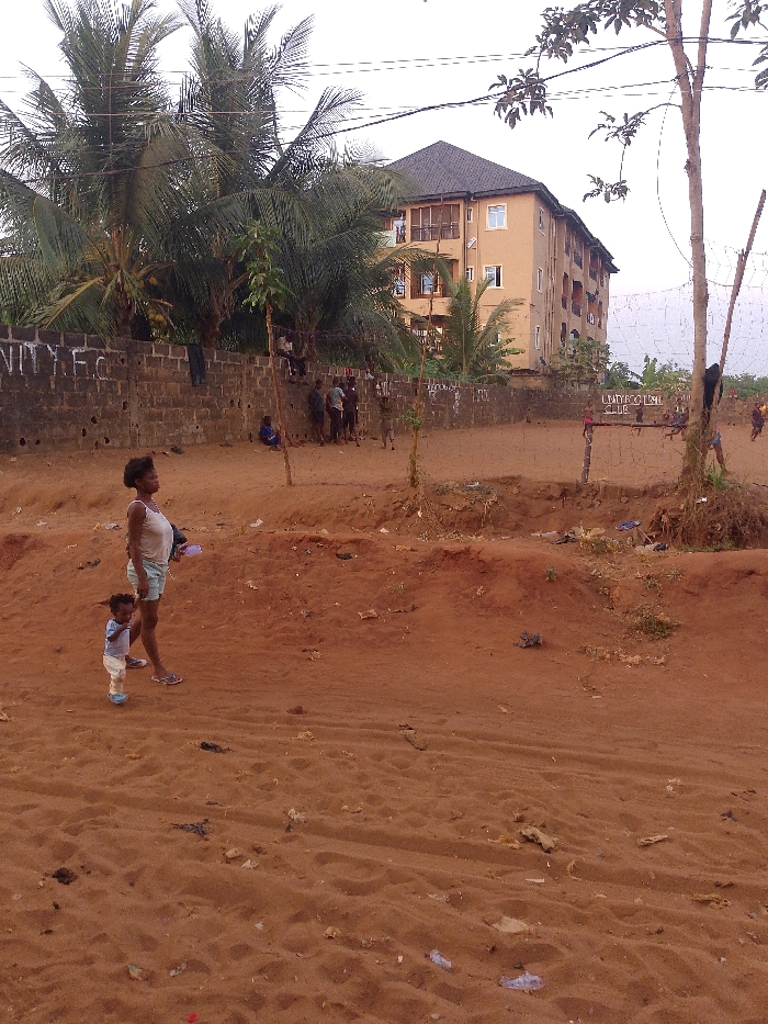 A young woman and child stand on a dirt road. Behind them is a brick wall labeled "UNITY FC," with several people sitting or standing along it. In the background is a multi-story building and palm trees. Beyond the wall, a soccer field is defined by makeshift goals. Trash litters the ground. The sky is overcast.