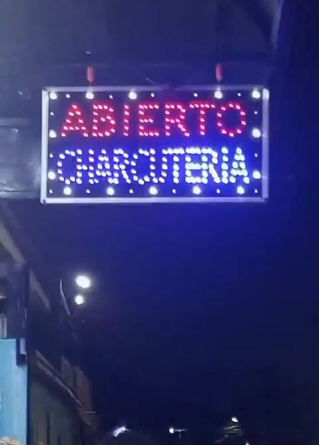 A sign reading "ABIERTO CHARCUTERIA" in red and blue LED lights hangs above a street at night