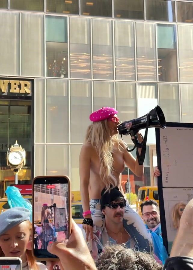 A crowd of people, mostly wearing pink hats, are standing in front of a building labeled "Trump Tower," holding up phones and signs. A woman with long hair and a pink hat is standing on a platform using a megaphone. She is speaking to the crowd, who is chanting back at her. The scene suggests a protest or demonstration, likely in response to Donald Trump or his policies.