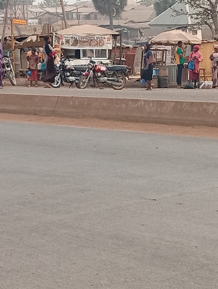 A street scene depicts a line of vendors along the edge of a road. Several individuals are standing near small food stalls, while motorcycles are parked on the curb. Some of the stalls have canopies offering shade. The atmosphere appears busy, with people going about their day in what looks like a market area. In the background, there are buildings partially obscured by a hazy or dusty atmosphere.