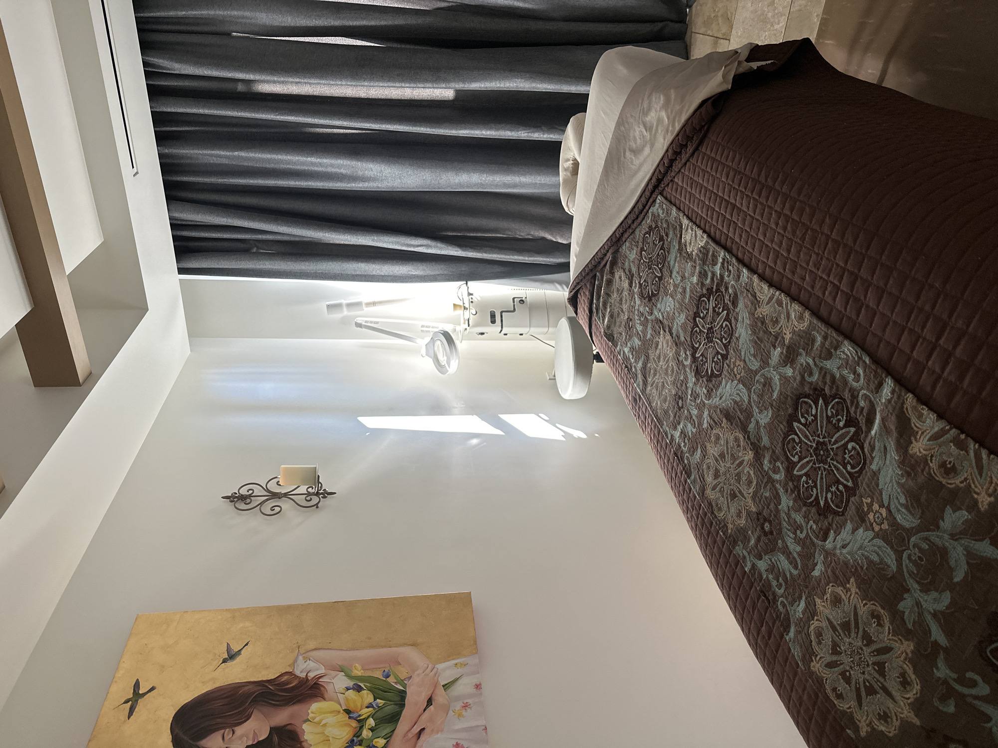 n interior view of a room, likely a bedroom or relaxation area, possibly located in Rancho Mirage, United States of America. The primary focus is a massage table positioned at an angle in the room. The table is covered with brown quilted fabric with a decorative blue and brown patterned runner. A light gray or white sheet is partially covering the end of the table closest to the camera. Behind the massage table, there is a height-adjustable examination table. The walls are white. There is a sconce holding a candle on the wall. Below the sconce, there is a painting or print of a woman holding flowers, primarily yellow tulips. The background features dark gray or black curtains partially obscuring a window or wall. Light is streaming through the window, creating bright highlights on the wall. The flooring is not fully visible, but a glimpse suggests light-colored tile. The ceiling is visible and is predominantly white. Along the left edge of the image are some beige or light brown architectural elements.