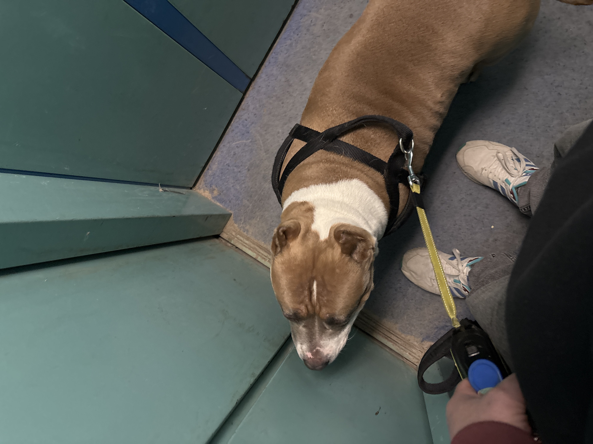 The image is taken from a high-angle perspective, looking down on a scene indoors. A brown and white dog wearing a black harness is in the center of the frame, its head close to a light blue surface. The dog's leash, yellow in color, is held by a person whose lower body and hand are visible on the right side of the image. The person is wearing grey pants and white running shoes with blue stripes. The surrounding environment appears to be a room with light blue walls and floor. The location is not identifiable from the image.