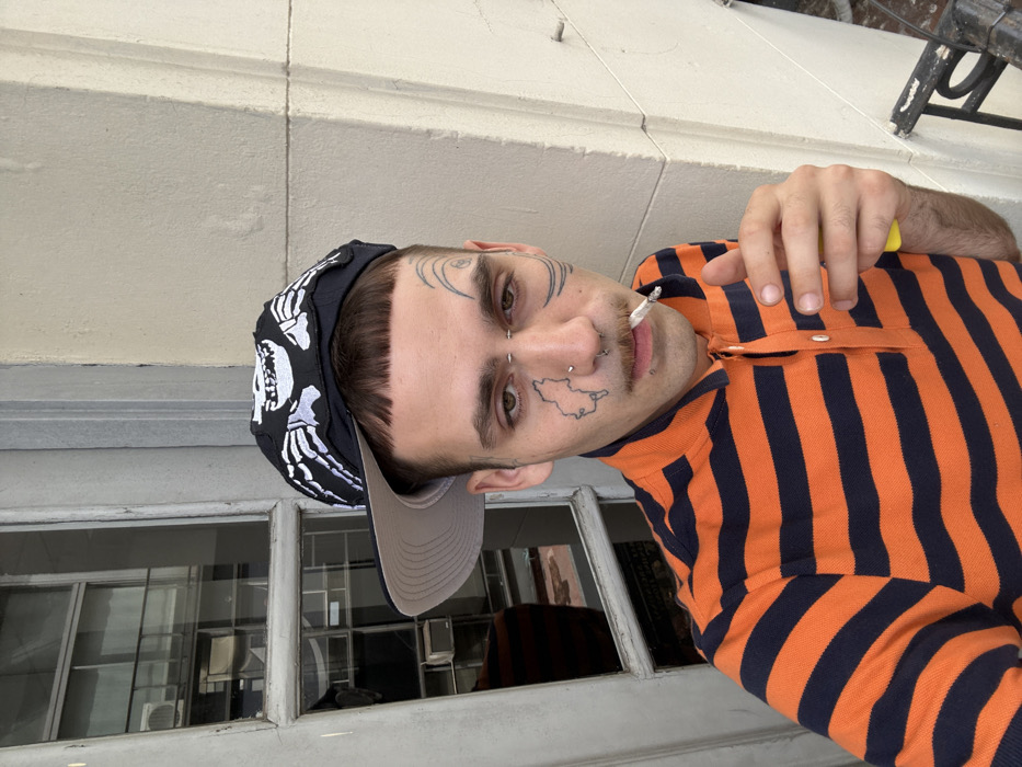 A man with facial tattoos wears a black and white baseball cap and an orange and navy striped polo shirt. He is holding a yellow object and has a cigarette in his mouth. The tattoos include circular designs above his eyebrow and an island shape on his cheek. He also has piercings in his nose and lip. The background features a window and a white building.