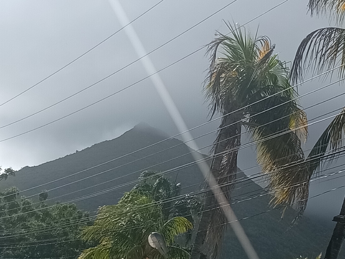 A hazy landscape features a mountain obscured by clouds, its peak barely visible. Numerous power lines crisscross the scene, partially obscuring the view. Palm trees are prominently featured on the right side of the image, their fronds creating a tropical foreground. Other trees and vegetation fill the lower portion of the scene. The lighting appears soft and diffused, contributing to the overall hazy atmosphere.