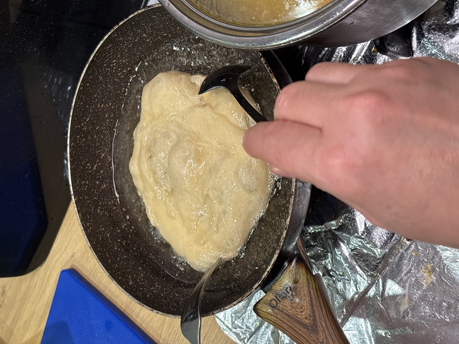 The image displays a close-up, elevated view of a cooking scene occurring in what appears to be a domestic kitchen. The primary subject is a large, irregularly shaped, light-colored food item, likely dough, actively deep-frying in a dark, speckled non-stick frying pan. The cooking oil surrounding the food is visibly bubbling. A human hand, identified as a light-skinned adult's right hand, holds a black-handled utensil, possibly a spoon or spatula, positioned to manipulate the food within the pan. Another silver-colored metal utensil is partially visible submerged in the oil on the left side of the pan, also in contact with the frying food. The frying pan rests on a surface partially covered with crumpled aluminum foil, which extends to the lower left of the frame. To the immediate left of the pan, a wooden handle of another utensil is visible, resting on the foil. Further to the upper left, a bright blue plastic cutting board is positioned on a light-toned wooden or laminate countertop. In the upper background, a dark, reflective surface, potentially a stovetop or appliance, is visible. To the right, a portion of a metallic pot containing a yellowish substance is visible. The specific location within the city of Haskovo, Bulgaria, cannot be determined from the visual information provided in the image.