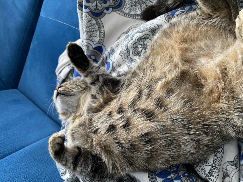 A domestic tabby cat is depicted lying on its back in a relaxed or sleeping posture within a residential interior in the city of Sredkovets, Bulgaria. The cat exhibits a fur coat predominantly brown, grey, and black, with distinct spotted and striped patterns, and lighter, golden-brown fur on its underside. Its head is tilted upwards and to the right, with closed or partially closed eyes, and its front paws are raised and slightly bent. The cat rests on a white fabric surface adorned with intricate blue and grey paisley-like patterns. Behind the cat, a solid blue, textured upholstered surface, consistent with furniture such as a sofa or headboard, is visible. The scene is illuminated by ambient light.