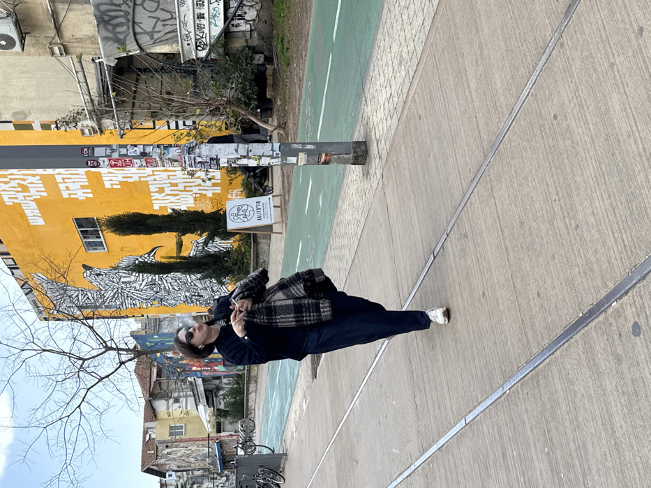 A person in dark clothing and sunglasses stands on a sidewalk, smoking. They wear a plaid jacket and white shoes. Behind them, a yellow building features a wolf mural and a sign with a circular design. A bike lane is next to the sidewalk, and a pole with posters stands nearby. Additional buildings and bare trees are visible in the background under a cloudy sky.