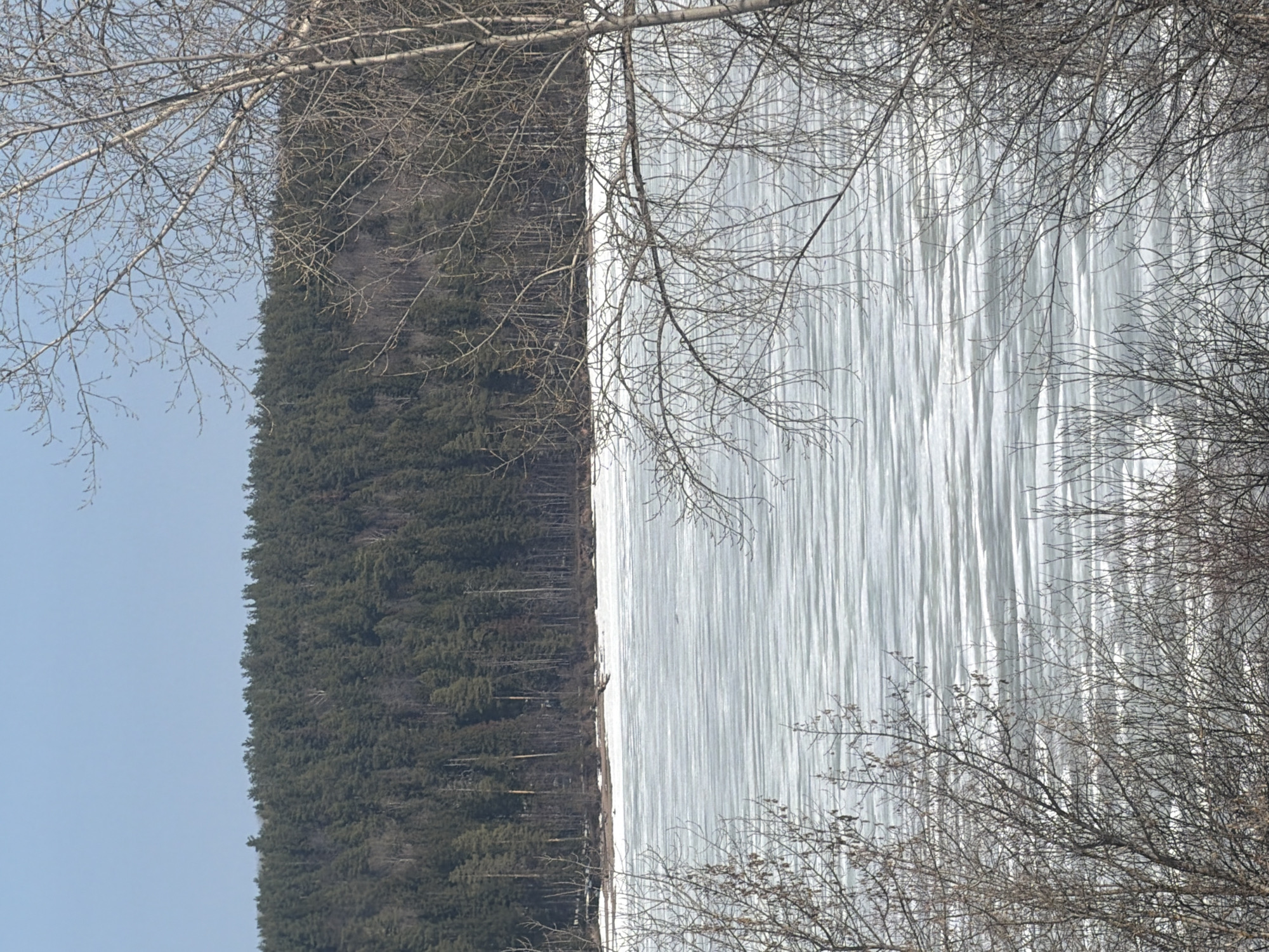 frozen body of water, likely a river or lake, next to a dense forest, possibly near Chaikovsky, Russia