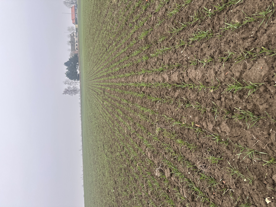 The image displays a wide-angle view of an agricultural field in Courchelettes, France, under an overcast sky. The foreground and midground are dominated by dark brown soil with numerous parallel rows of young, green crops, likely cereal grains, extending towards the distant horizon. The rows are uniformly spaced and run perpendicular to the viewer's perspective. In the distant background, a line of trees, including bare deciduous trees and dark green evergreens, partially obscures a cluster of buildings. To the right of the trees, a multi-gabled building with light-colored walls and a dark roof is visible, along with a smaller, red-roofed structure further right. Several indistinct vehicles are partially visible near these buildings. No people or animals are present. The sky is uniformly light grey, indicating heavy cloud cover or fog, which softens the light and reduces clarity of distant objects.