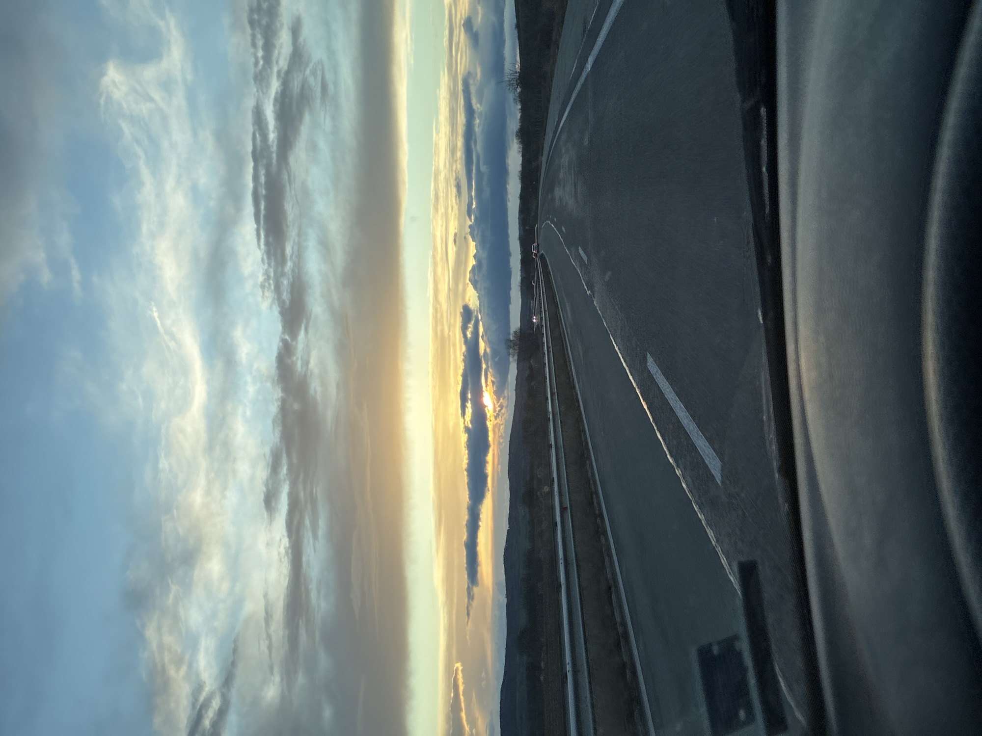highway road with painted white lines and barriers on the sides. The sky is visible in the background, featuring a sunset with clouds and a yellow glow. The scene is taken from inside a vehicle. The location is Rogozinovo, Bulgaria.