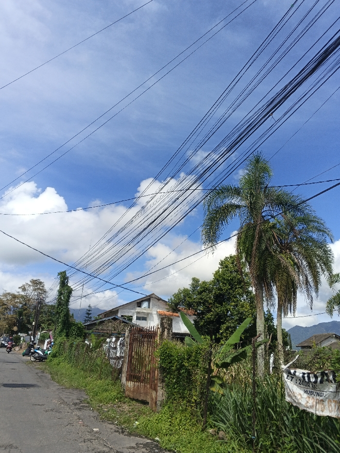 The image captures an outdoor street scene under a bright blue sky with scattered white cumulus clouds, located in a semi-urban or rural area of Đà Nẵng, Vietnam. Numerous black utility wires are strung across the entire upper half of the frame. A dark, paved asphalt road occupies the lower left, with green weeds and grass growing along its edge. Two motorbikes (scooters), one blue/white and one darker, are parked on the far left beside the road. A rustic, overgrown fence, constructed with concrete posts and possibly wire mesh, runs horizontally across the midground, separating the road from residential properties. The fence is heavily covered in green vines and foliage. A rusty, brown metal gate, appearing in disrepair, is visible within this fence towards the left-center. Behind the fence, a two-story house with white walls and a reddish-brown tiled roof is present, featuring a distinct arched window on its upper level. To the right of the house, dense green trees and two tall palm trees with slender trunks and lush fronds are prominently situated. A weathered white fabric banner, partially obscured and displaying black text including "HUBUNGI:" and a partial phone number "085", hangs from the fence on the right side of the frame. Distant green hills or mountains are visible in the background beneath the horizon. No individuals are visible in the scene.