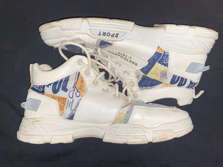 The scene is set in Sabon Tasha, Nigeria. The image displays a pair of worn white chunky sneakers, positioned against a plain black background. The shoes are oriented on their sides, with the toes pointing left. Both shoes feature white synthetic uppers, white shoelaces, and thick, multi-textured white soles. The soles exhibit scuff marks and dirt, particularly on the edges and lower portions, indicating prior use. Distinctive multi-colored fabric inserts are integrated into the sides of both shoes. These inserts display a pattern consisting of sewing and tailoring motifs, including depictions of scissors with orange handles, spools of blue, yellow, and green thread, and various fragmented words such as "DRESS," "beautifully made," "scissors," "Order Now," "AMAZING," and "UP." On the outer side of the right shoe, a gray rectangular plaque on the sole bears the word "SPORT." Above this, vertically oriented text on a white panel reads "SAKTEOABRD c.1975." A light blue fabric pull tab is visible at the heel of each shoe. No people, active interactions, or further environmental details are present in the frame. The lighting suggests an indoor setting with a consistent, dark backdrop.