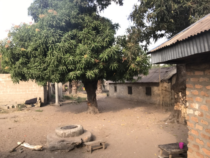A rural landscape features rudimentary structures. A large tree with dense foliage dominates the scene. A well constructed of concrete rings sits in the foreground near a small wooden stool. Buildings with corrugated metal roofs are visible in the background, their walls appearing aged and simple. The ground is a mixture of dirt and sand. The overall atmosphere suggests a poor rural village.