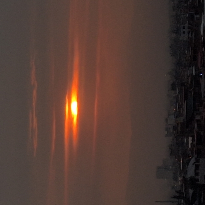 hazy orange sunset over a cityscape. Buildings and rooftops are visible on the right, appearing dark and indistinct due to the dim light. The sun is a bright, oblong shape with vertical streaks of light emanating from it. A smoky or foggy atmosphere obscures the sky, giving the image a muted and indistinct appearance.