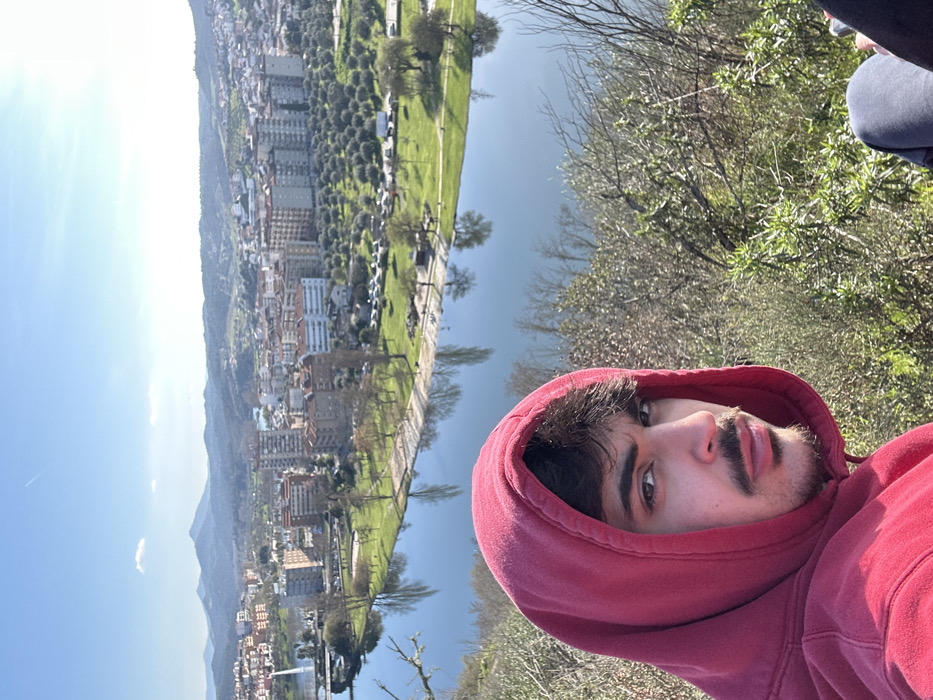 A young male wearing a red hooded sweatshirt with the hood up is positioned in the lower left foreground, looking directly at the camera. He has dark hair, a mustache, and a short beard. The image is captured from an elevated perspective, providing an expansive view of the city of Mirandela, Portugal. The immediate foreground features dense green and some bare shrubbery. Below, the calm Tua River flows, reflecting the bright blue sky. On the opposite bank, a green park area with scattered trees borders the river, backed by the urban development of Mirandela. The cityscape includes numerous multi-story buildings, some with red-tiled roofs, and a distinctive white bridge with a tall, decorative arch-like structure spans the river on the left side of the frame. To the right within the city, a substantial olive grove is visible. Rolling, green-covered hills and mountains form the distant background under a clear blue sky, which contains a faint contrail and minimal white clouds. A partial view of another person's leg, clad in dark pants, is visible in the lower right corner.