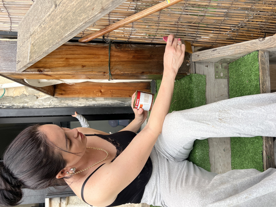 Kiryat Yam, Israel: An outdoor scene depicts a woman performing property maintenance. She is seated on the second of three visible wooden steps, each covered with artificial green turf. The woman wears a black lace-trimmed camisole, light grey wide-leg trousers with minor stains on the left leg, a gold chain necklace, and large silver-toned hoop earrings. Her dark hair is styled in a bun. She holds a red and white can with Hebrew text in her right hand and a brush with a pink handle in her left, applying a substance to a vertical natural bamboo screen positioned to her right. The bamboo screen is secured to a weathered wooden post, around which green wire is visible. In the background, to the woman's left, a child's arm in a light grey sleeve extends from a dark doorway, with a light blue object partially visible inside. A light brown wooden pole leans against the bamboo screen on the right. A metal bracket is attached to the second step.