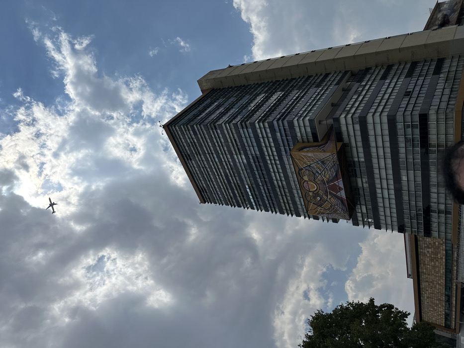 The scene displays the Pemex Executive Tower (Torre Ejecutiva Pemex) in Mexico City, Mexico, under a partly cloudy sky. The tall, rectangular skyscraper, predominantly dark-paned with visible horizontal banding, occupies the right two-thirds of the image. A large, multi-colored mural, identified as "La Conquista de la Energía" by José Chávez Morado, is prominently affixed to a mid-section of the tower, projecting outwards and featuring geometric and symbolic designs, including a central eye-like motif. A silhouetted twin-engine passenger aircraft is visible in the upper-center sky, traversing a bright, cloud-filtered patch of sunlight. The sky contains a mix of diffused grey and white clouds alongside areas of clear blue. A dark green tree canopy is partially visible on the far left. The top of an individual's head, showing dark hair, is present at the bottom edge of the frame, indicating the vantage point.