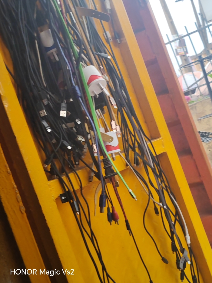 The image displays a dense collection of various electrical cables and connectors, predominantly black, arranged against a bright yellow vertical panel. Visible connectors include numerous USB Type-A (male and female), Micro-USB, Mini-USB, USB-C, RCA audio/video (red, white, yellow), and 3.5mm audio jacks. Several white power adapters with red accents, featuring two or three prongs, are interspersed among the cables. The cables are either hanging loose, loosely coiled, or secured by small, inconspicuous hooks on the yellow surface. In the background, beyond the yellow structure, elements of an urban environment are discernible, including metallic railings or fencing and indistinct building outlines under an overcast sky. The scene is consistent with an electronics repair shop, market stall, or retail display in a commercial area within Animashawun, Nigeria. No individuals are visible in the frame. The image bears an "HONOR Magic Vs2" watermark.