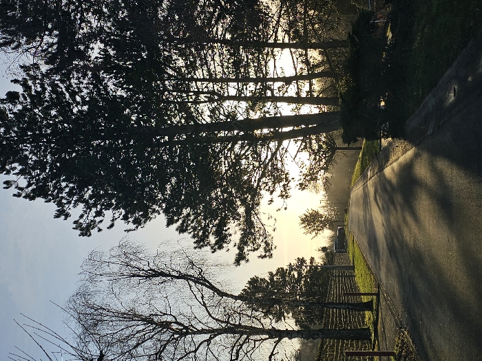 A winding road leads toward a blurred horizon, framed by silhouetted trees and a light-filled sky. Tall pines on the left cast long shadows, contrasting with the sun's glow filtering through their branches. A bare tree stands prominently in the foreground, its delicate branches reaching toward the sky. On the road's edge, a small retaining wall lines a grassy strip.