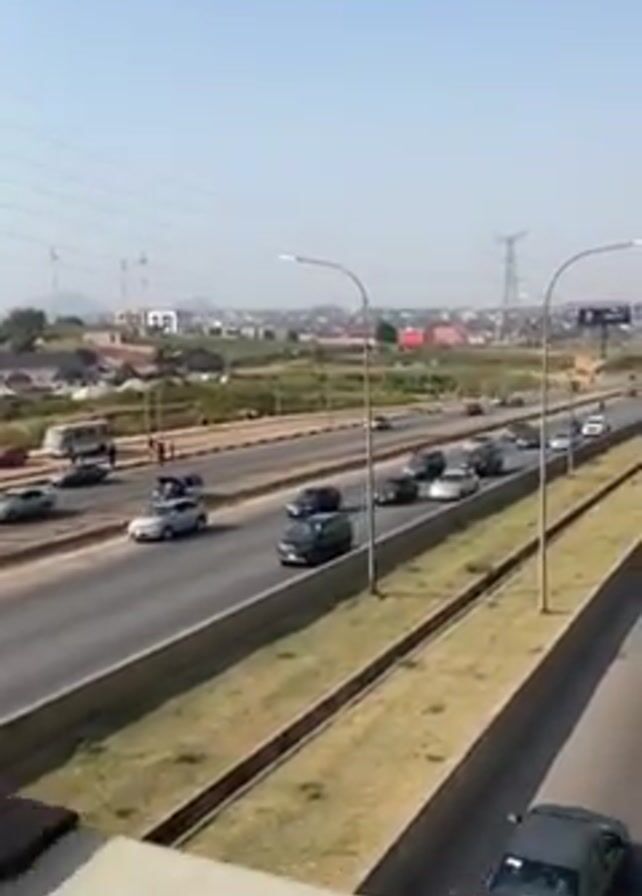 multi-lane highway with moderate traffic, viewed from an overpass. Cars, vans, and other vehicles move along the highway in both directions. Power lines and utility poles are visible alongside the road and in the distance, with a suburban area with houses and other buildings also in the background. The sky is clear and blue. The video is shot from a static position, looking down at the highway.