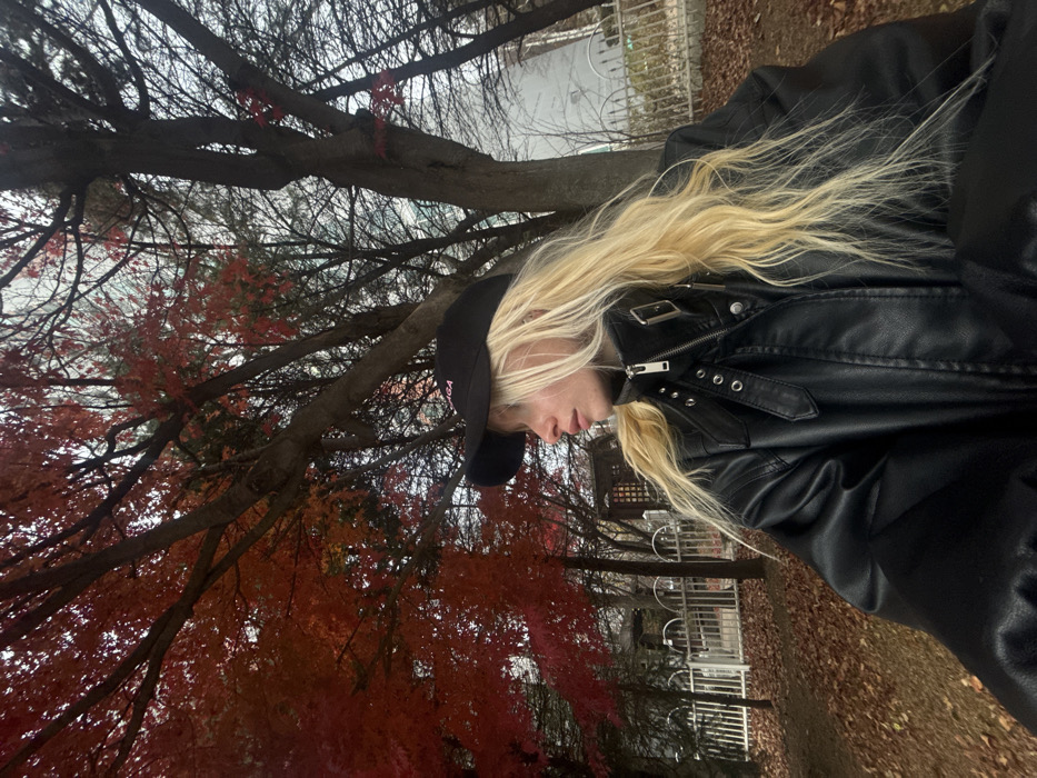 A woman with long blonde hair wears a black leather jacket and a black baseball cap with pink lettering. She stands outdoors among trees with reddish-brown leaves. A metal fence and some buildings are visible in the background, blurred by the focus on the woman and foliage in the foreground. The ground is covered with fallen leaves. The photo is shot from a low angle.