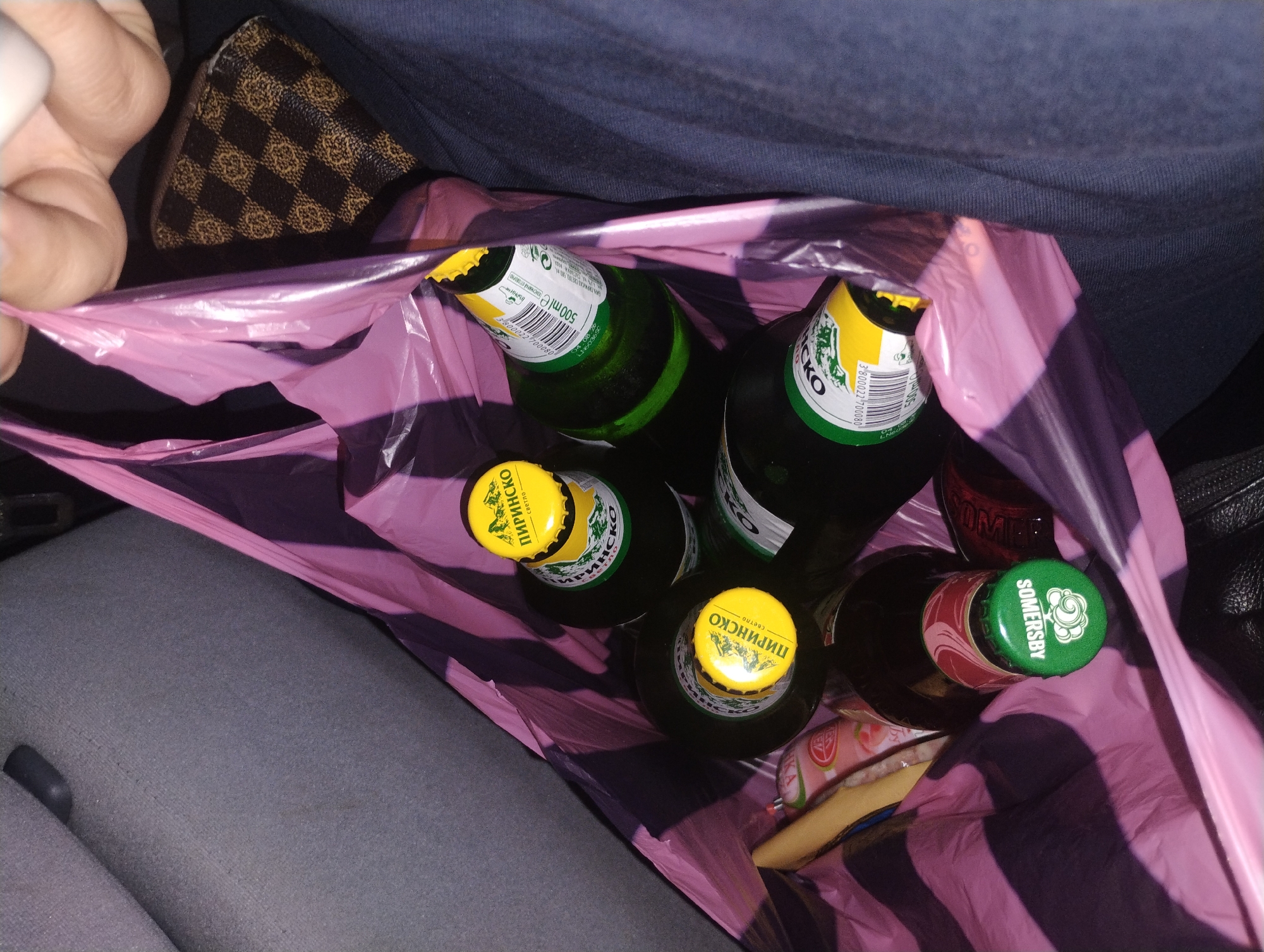 The image displays a high-angle view within a vehicle in the city of Opan, Bulgaria, showcasing a pink plastic shopping bag with dark stripes. The bag contains multiple beverage bottles. Prominently visible are at least four green glass bottles of "Пиринско" (Pirinsco) beer, identifiable by their yellow caps featuring a mountain logo and Cyrillic text, with one label displaying "500ml e" and barcode "3800227700080". Also present is one dark red/brown bottle with a green cap labeled "SOMERSBY". Partially obscured items within the bag include a pink cylindrical object and a light-colored rectangular object. The bag rests on a grey fabric car seat, visible on the left side of the frame. To the right, a section of dark blue fabric, consistent with clothing, is visible, along with a light-skinned hand holding the bag. A brown wallet or small pouch with a checkerboard pattern is positioned behind the hand and clothing.