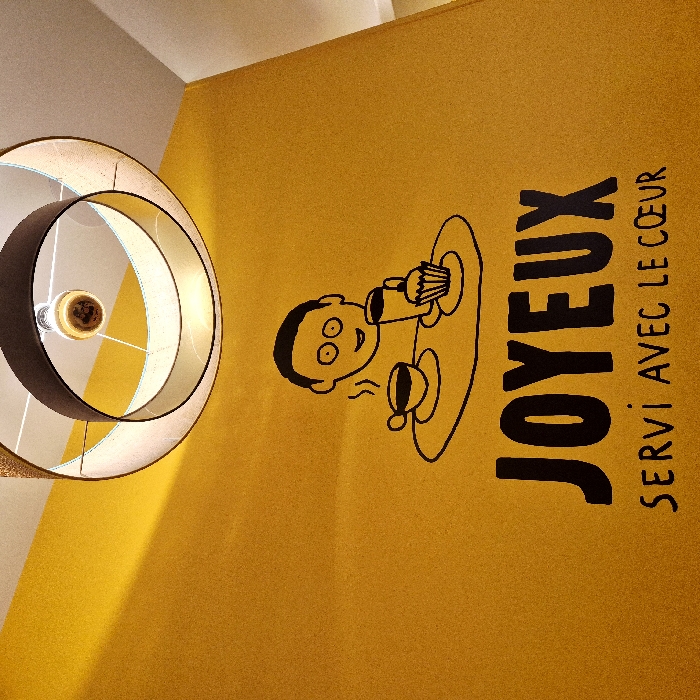 A room's corner shows a yellow wall with a black cartoon drawing of a person at a table with a cupcake and coffee. Beside the drawing, the word "JOYEUX" is written in large black letters, followed by "SERVI AVEC LE CŒUR." A modern, circular ceiling light fixture hangs nearby. The wall's color creates a warm and inviting ambiance.
