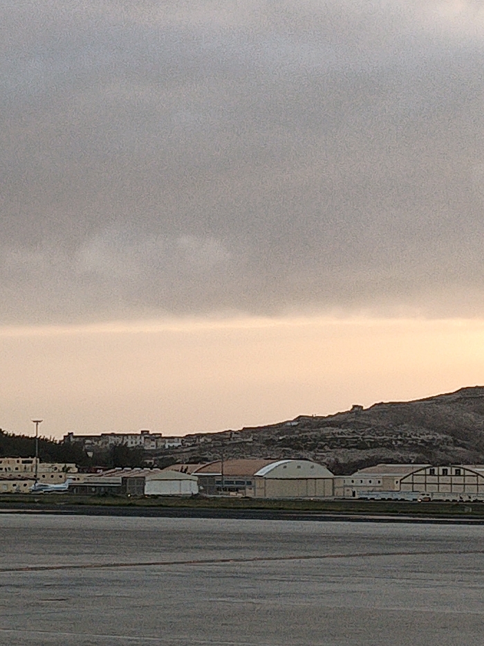 The image displays an exterior airport scene, situated in Ingenio, Spain, likely Gran Canaria Airport. The upper two-thirds of the frame are occupied by a heavily overcast sky, exhibiting dark grey clouds at the top that transition to a narrow, horizontal band of lighter, yellowish-orange light along the mid-horizon. The background reveals a series of dark, rocky hills with scattered, unidentifiable structures and buildings positioned along their slopes and at their base. In the midground, multiple large-scale buildings are visible, consistent with aircraft hangars, featuring varying architectural styles including both arched and rectangular roofs. A small, white fixed-wing aircraft is partially discernible on the far left side, positioned on the tarmac adjacent to one of these structures. A tall, slender pole or mast stands erect on the far left. The foreground consists of a dark grey asphalt or concrete surface, characteristic of an airport runway or taxiway, bordered by a narrow strip of green grass before the midground buildings. No individuals, explicit actions, or interactions are present within the frame. The lighting is diffused, indicating overcast conditions or twilight.