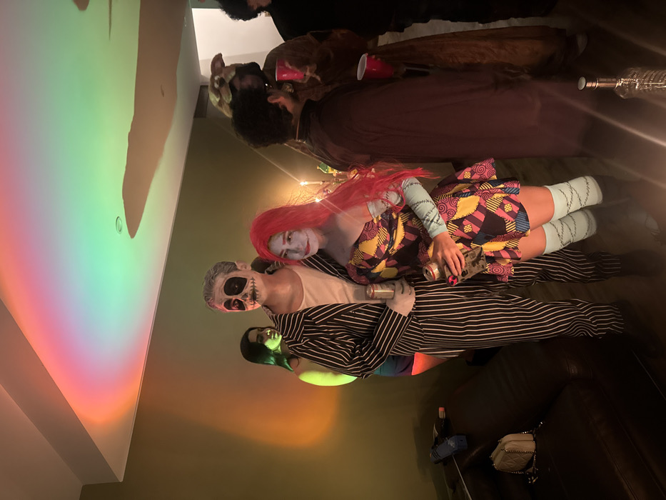 An indoor scene in Zibatá, Mexico, depicts a gathering of at least seven individuals, primarily focused on a costumed couple in the foreground. The room features plain, light brownish-green walls and a light-colored ceiling illuminated by a projected rainbow spectrum of light (red, orange, green, blue). In the center foreground, a male dressed as Jack Skellington wears a black and white pinstripe suit, white skull makeup with black eye sockets and mouth stitches, and grey hair. He holds a silver beverage can in his gloved left hand. To his right, a female dressed as Sally wears a patchwork dress, a long red wig, and blue-grey face makeup with stitch detailing. She holds a dark beverage bottle with a prominent red ring in her right hand and wears light blue thigh-high socks with stitched patterns. Both central figures are positioned front-facing or slightly turned to their right, looking generally forward. In the left background, a woman with dark hair is partially visible, illuminated by a green light source, and appears to be smiling. In the mid-ground right, a person in a brown, furry costume holds a red plastic cup. Another individual in dark attire is partially visible to the right of the furry costume. The room is dimly lit, with additional warm light emanating from candles visible on a surface behind the central couple. A dark brown leather couch is present on the lower left, upon which a light-colored handbag and other unidentified items are placed. The floor is dark. A clear glass bottle with a distinctive ribbed texture is visible on the floor on the far right. The scene suggests a social event or costume party.