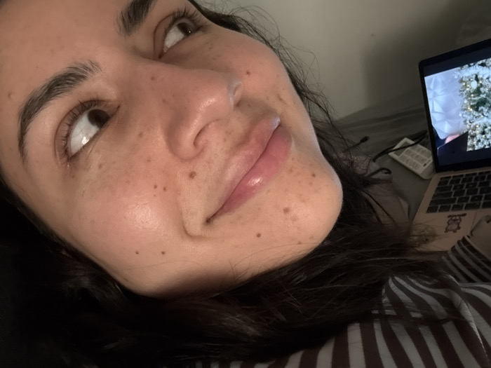 A woman lies down, gazing upward with a slight smile. Freckles dot her fair skin. Beside her, a laptop displays a scene with a white Christmas tree. A wireless mouse and other items rest on the bed near the laptop. She wears a striped brown and white top.