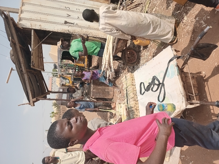 The scene takes place in a bustling street market in Badiko, Nigeria, located at the coordinates 10.538 latitude and 7.406 longitude. A group of men and boys gather around a makeshift stall constructed from a corrugated metal sheet and a wooden awning. A young man in a pink shirt stands in the foreground, holding a bottle of what appears to be a sugary beverage. A second young man, standing behind him in a white shirt, is handing him a bundle of sugarcane. The stall itself is laden with bundles of sugarcane, and a man in a green shirt, standing behind the stall, is working on preparing them. A child stands to the right of the stall, dressed in a white flowing robe. A yellow tricycle, partially visible in the background, is parked nearby. The scene depicts everyday commerce and interaction in a rural Nigerian setting.
