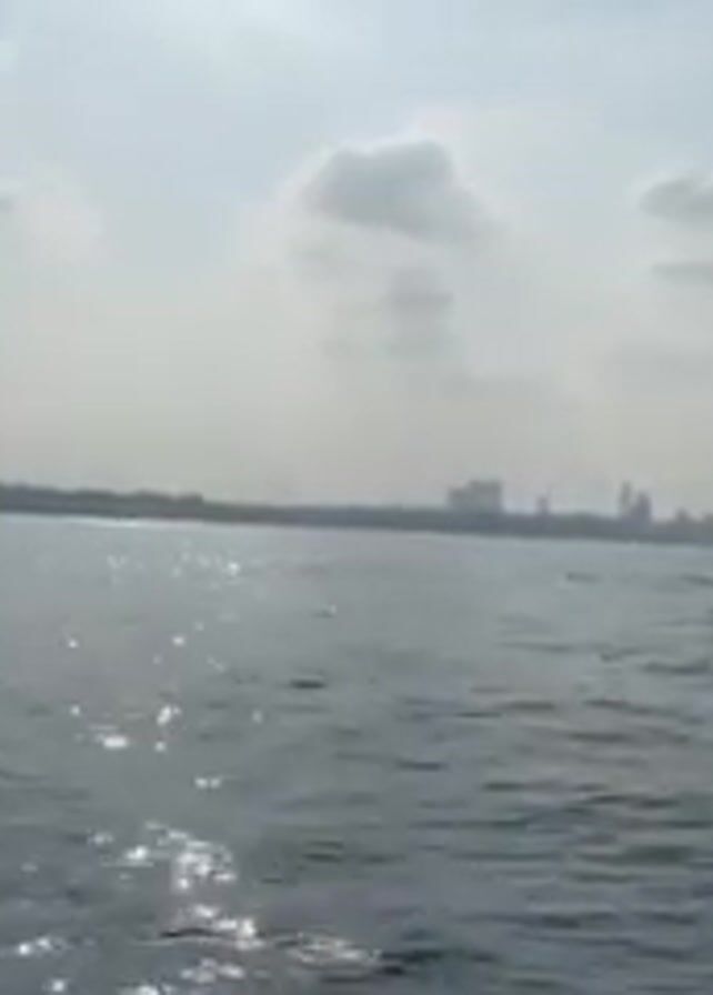 n ocean view. The water is dark blue and rippled, with some areas reflecting sunlight. In the distance, a skyline of buildings is visible, silhouetted against the hazy sky. The sky is light blue with some scattered clouds.