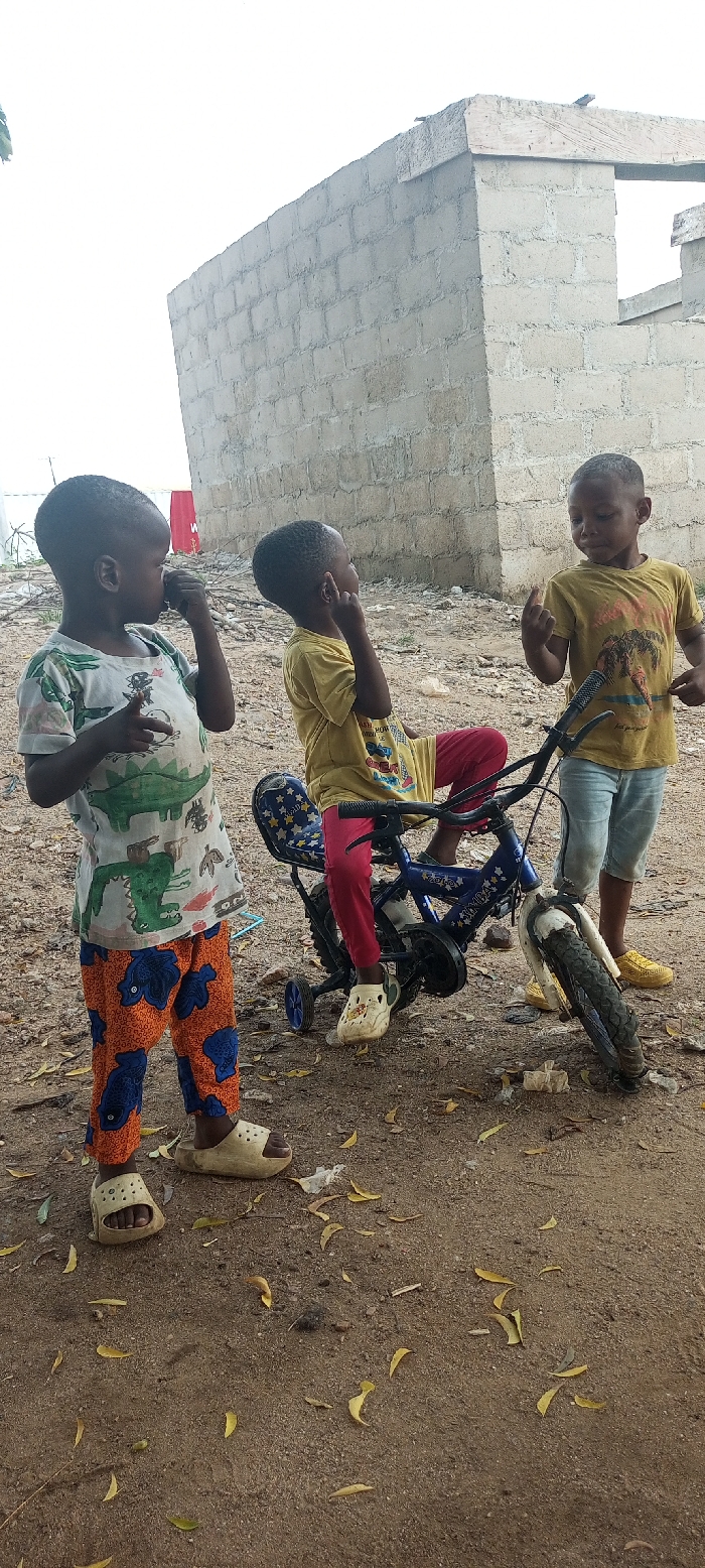 Three young children are depicted outdoors in Adankolo, Nigeria, standing on a dirt ground scattered with dry leaves and debris. In the background, a partially constructed building made of concrete blocks is visible under a bright sky. The child on the left, wearing a white t-shirt with green dinosaur prints and orange patterned trousers with white plastic clogs, stands with their left hand near their mouth. A second child is seated on a blue bicycle with training wheels, wearing a yellow t-shirt, red trousers, and white plastic clogs, with their right hand raised near their head. The third child, on the right, wears a yellow t-shirt, light blue shorts, and yellow footwear, standing beside the bicycle with their right hand raised in a gesture and looking towards the left. The blue bicycle has a star-patterned seat and "NIMJA" visible on its frame.